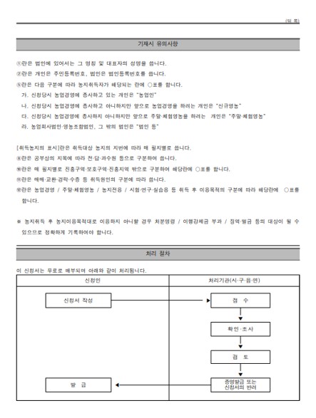 실제 농사를 짓는 것이 목적인 경우에는 농업경영계획서를 별도로 작성하여야 하며 다른 이유로 신청하고자 할 때에는 신청서만 제출합니다.