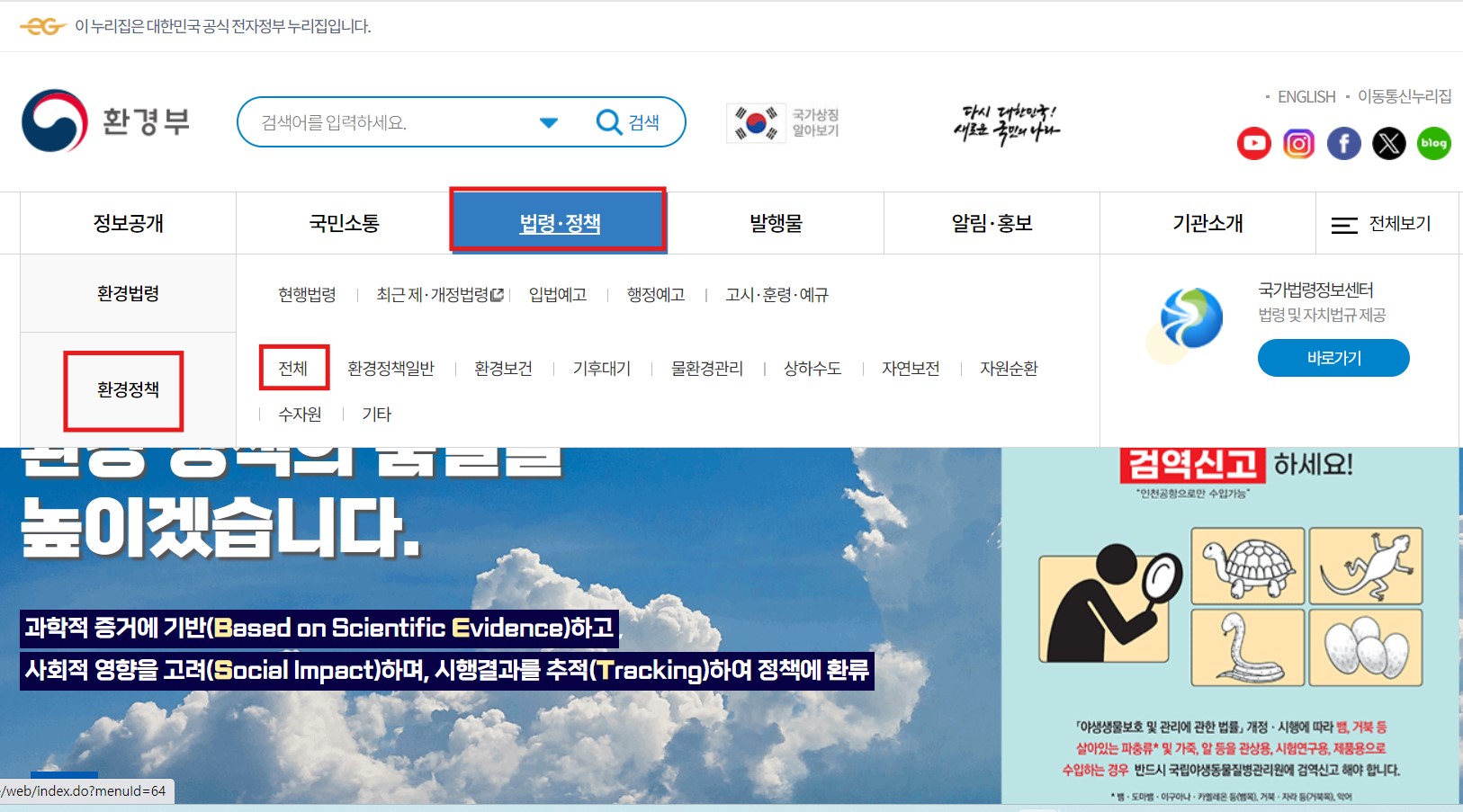 2. 메뉴 [법령, 정책 - 환경정책 - 전체]를 클릭합니다.